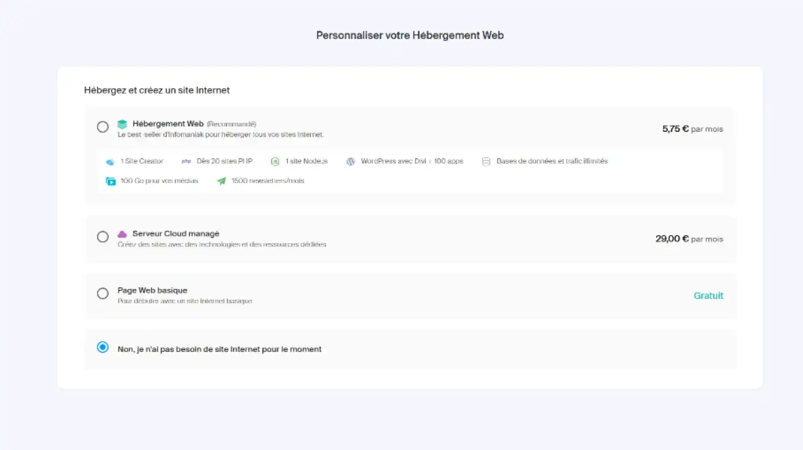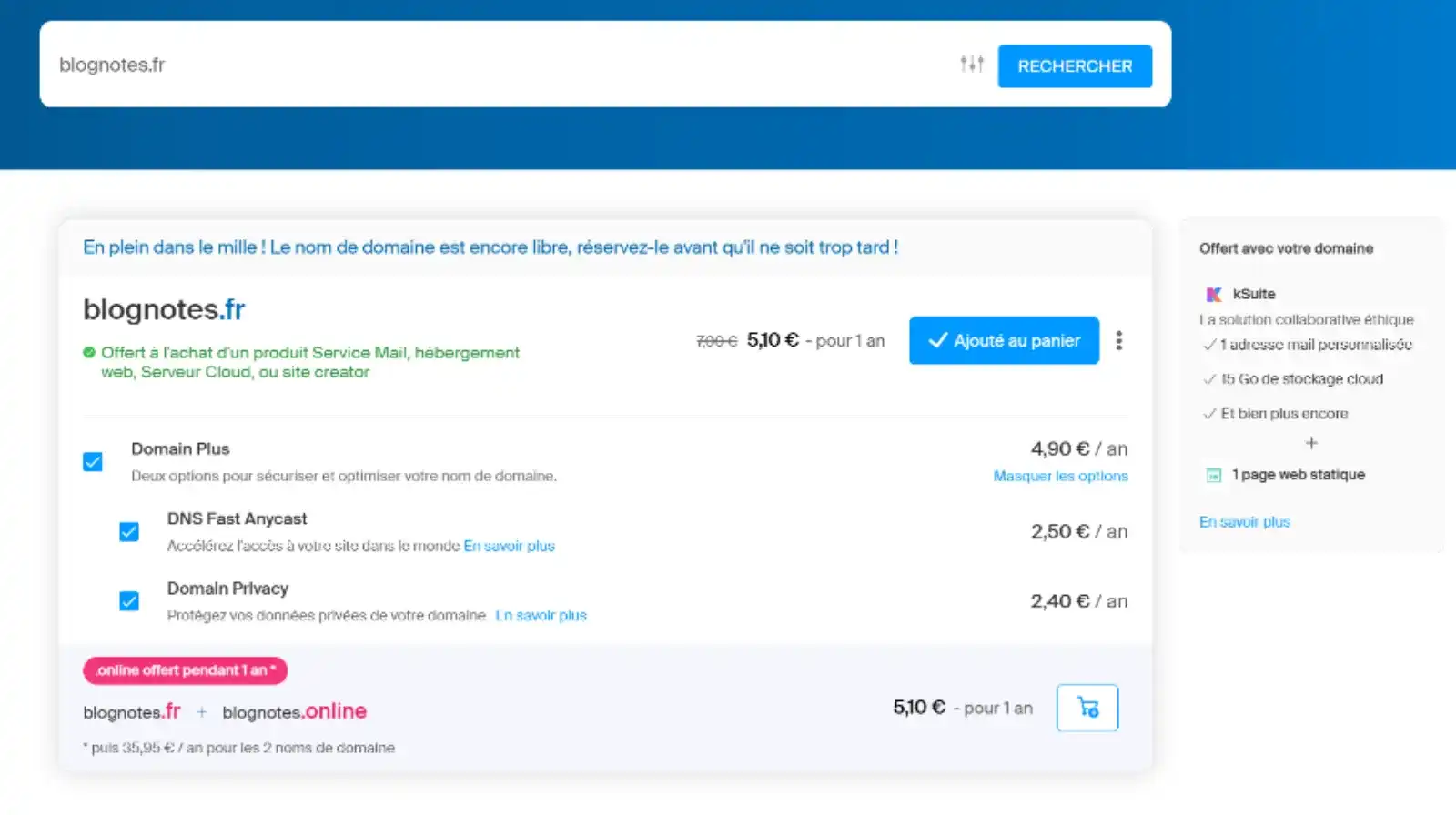 Le registraire – hébergeur vous proposera diverses options complémentaires. Vous pourrez généralement souscrire à celles-ci ultérieurement, si besoin.