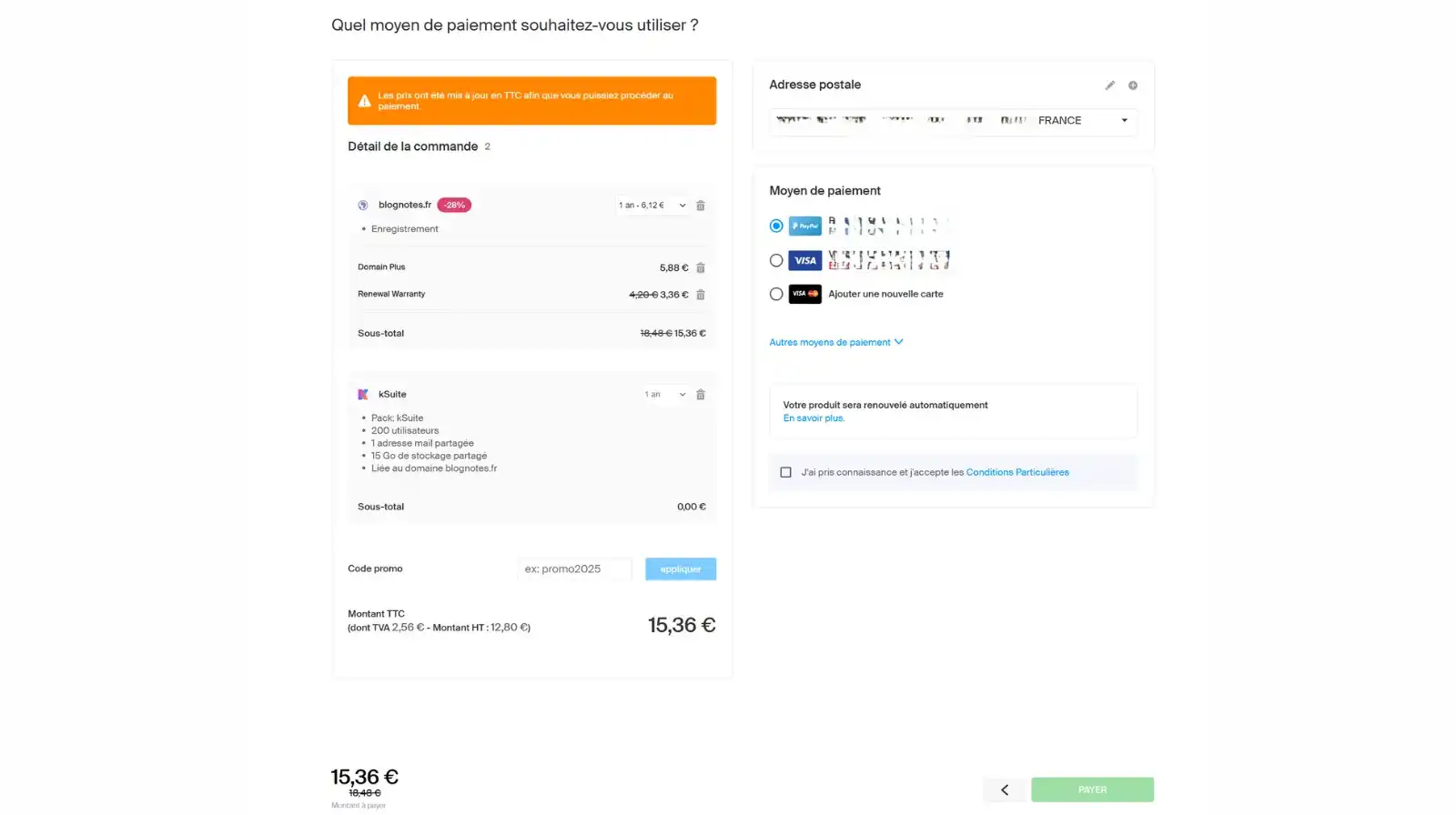 Et l’on procède au paiement, ici 15€ pour un an de validité, avec des options non indispensables, protection de la propriété du NDD et utilisation du DNS de « diffusion », qui ont doublées le prix normal.