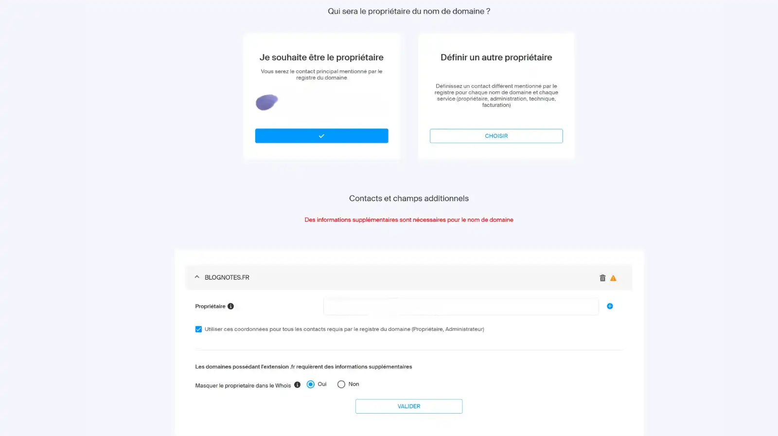 Attestez que vous serez le propriétaire du NDD ainsi que son inscription au Whois, un protocole et un service de recherche permettant d’accéder à des informations publiques sur les noms de domaine, les adresses IP ou les systèmes autonomes sur Internet.