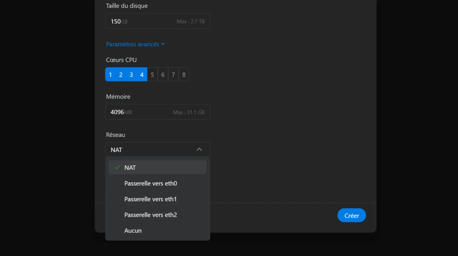 Suivez le tutoriel Créer une VM en NAT jusqu'au point 4. Les paramètres - et déployez Paramètres avancés et choisissez la passerelle active – pour ce tuto c’est Passerelle vers eth0