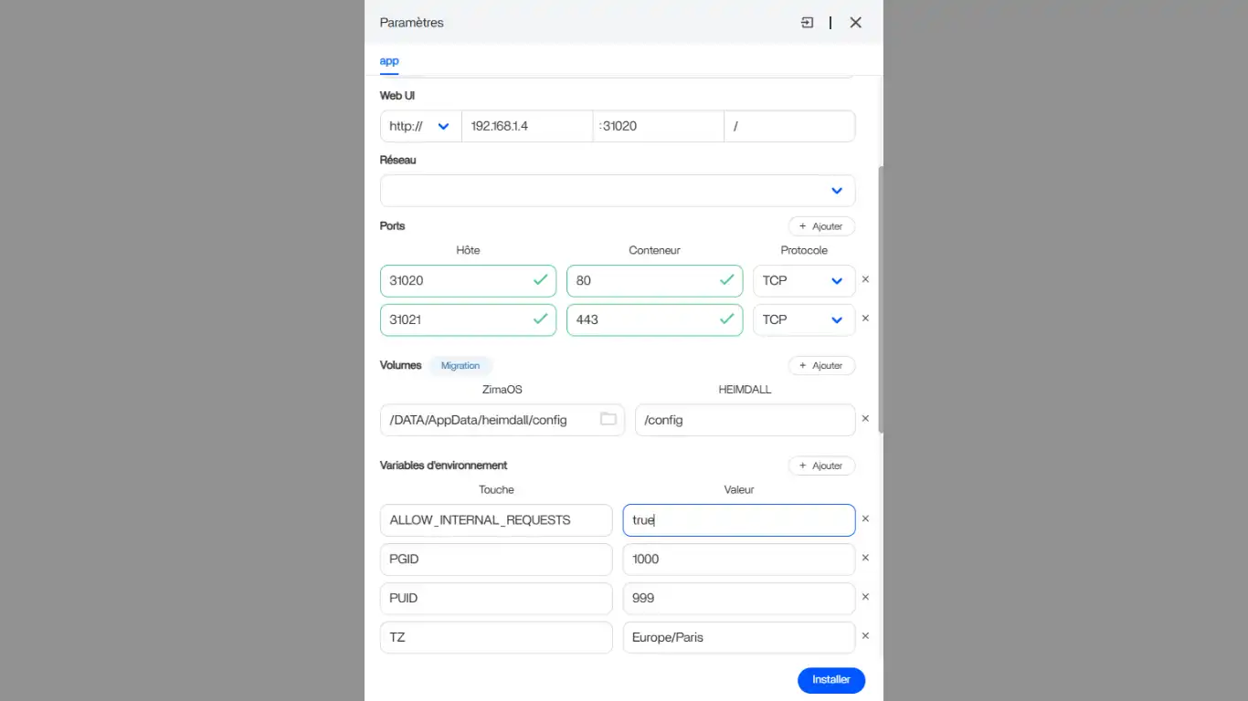3. Remplacez le chemin hôte / ZimaOS à Volume (fenêtre de gauche) par /DATA/AppData/heimdall/config