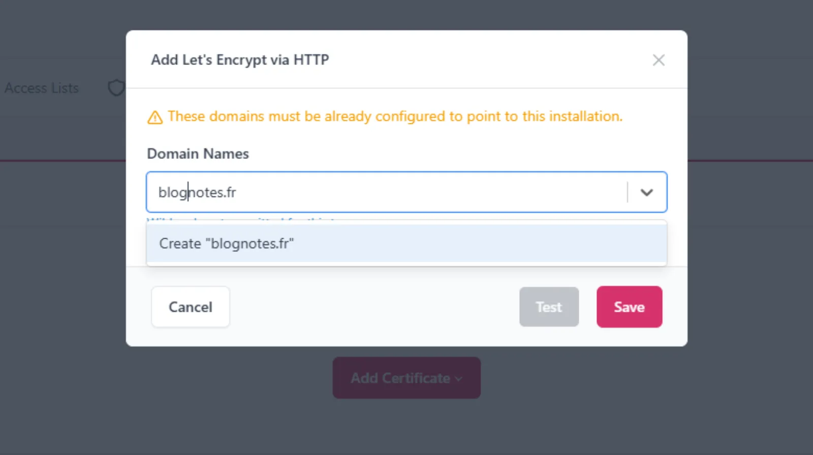 Cliquez sur l'onglet Certificates puis sur Add Certificate -> Let's Encrypt via HTTP