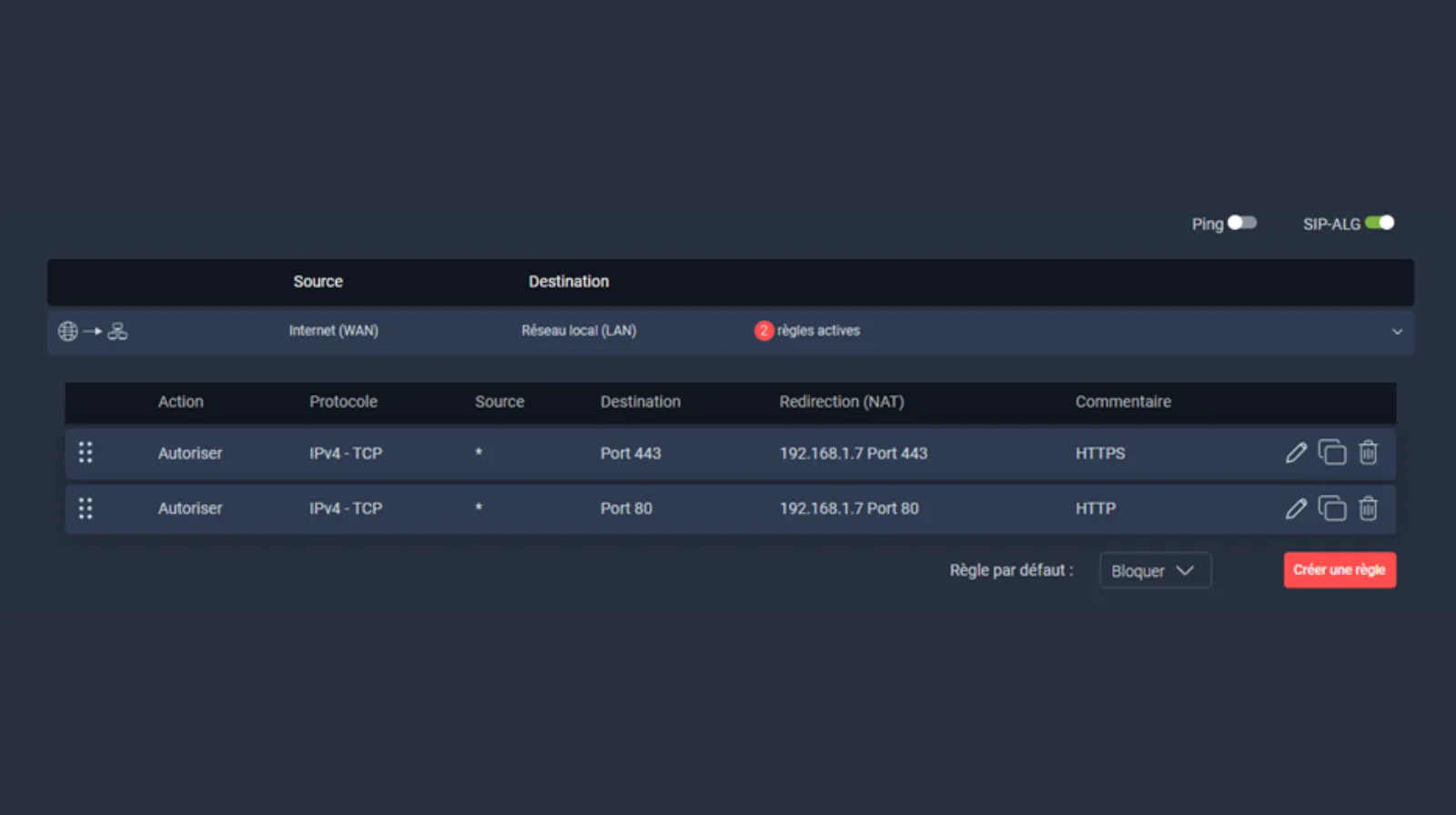 Ouvrez les ports 443 et 80 pour le serveur. L'onglet de la Box se nomme souvent NAT ou NAT/PAT ou Sécurité. Vous devez créer 2 lignes. Une première ligne sur l'adresse IP locale et/ou Nom du Serveur pour le port 80 interne et externe et une deuxième pour le port 443 interne et externe. Par exemple, sur l'illustration le serveur est à l'adresse locale 192.168.1.7 et sont ouverts les deux ports 443 et 80 en TCP. Concernant la fenêtre Source, laissez par défaut Toutes ou *