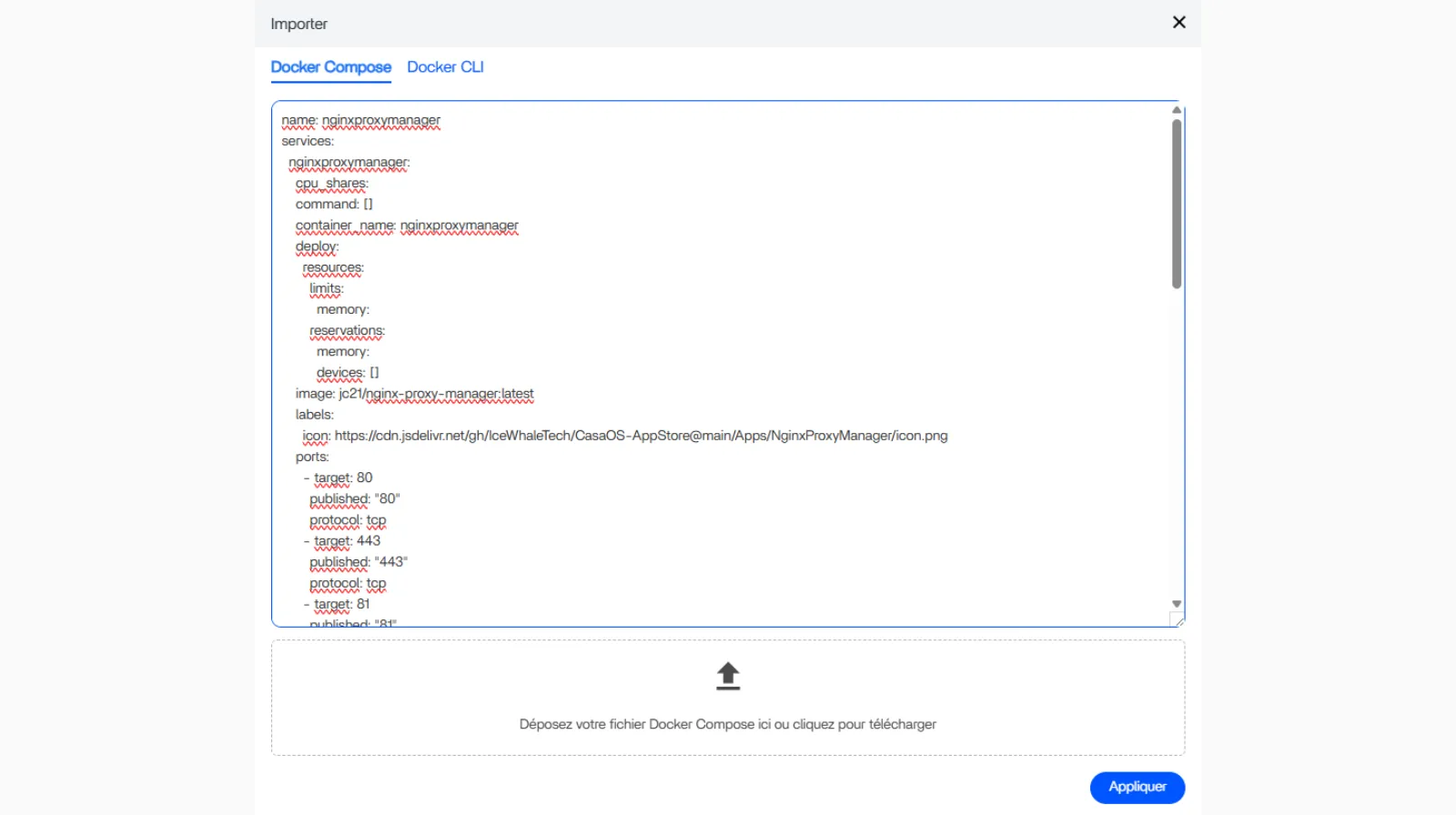 2.3. Le pop-up vous propose d’importer votre configuration avec un fichier YAML ou de copier-coller celle-ci dans la fenêtre dédiée. Vous pouvez agrandir cette fenêtre en sélectionnant les deux traits en bas à droite.
