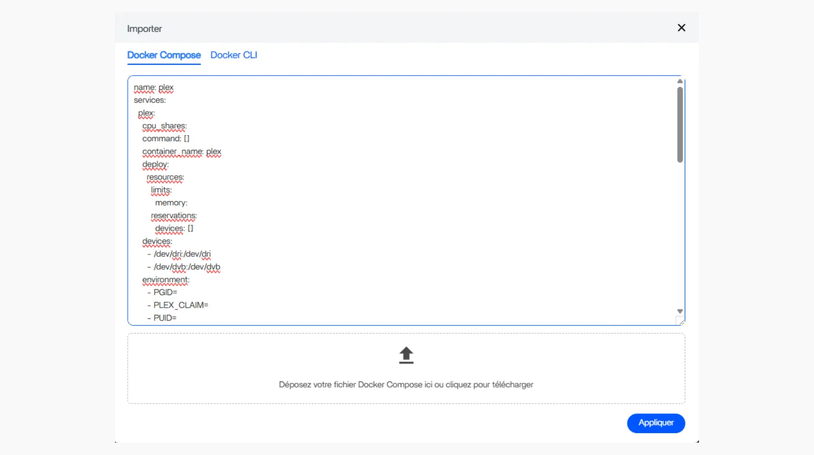 Le pop-up vous propose d’importer votre configuration avec un fichier YAML ou de copier-coller celle-ci dans la fenêtre dédiée. Vous pouvez agrandir cette fenêtre en sélectionnant les deux traits en bas à droite.