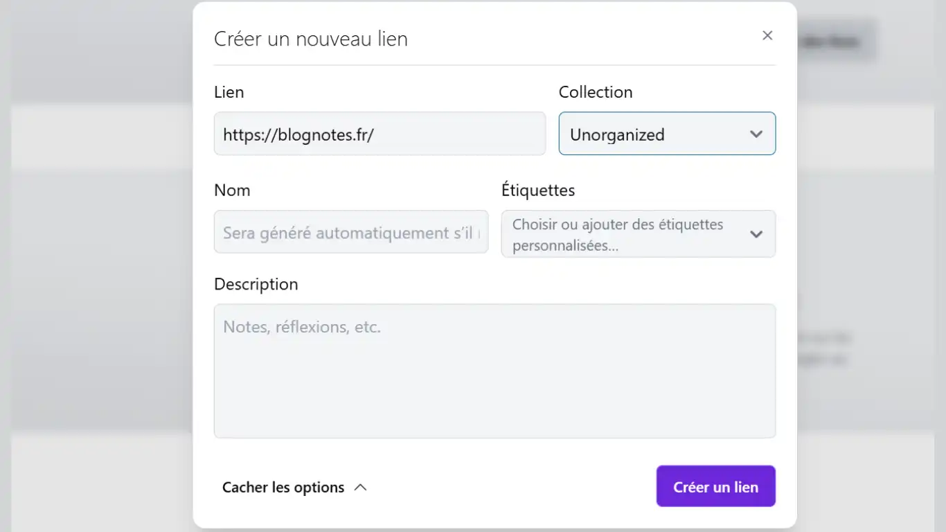 Ajoutez une URL d'un site (icône + en haut à droite), organisez vos collections thématiques, ajoutez des étiquettes, un descriptif ...