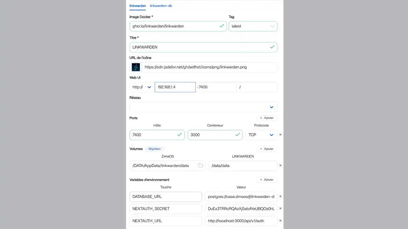 Si vous avez choisi de configurer l'application avec celle proposée par l'App Store, modifiez le Tag de l'image de Linkwarden à : latest et celle de la DB (Postgres) à 17.