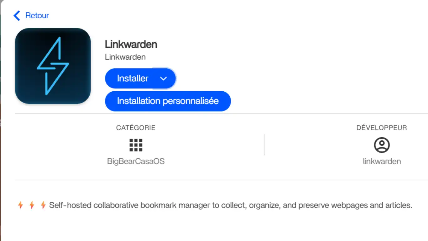 Cliquez sur l'icône de l'app proposée par BigBearCasaOS et sélectionnez sous le bouton Installer -> Installation personnalisée