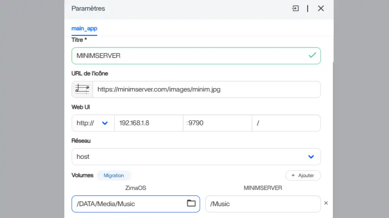 Sur les paramètres indiquez dans Web UI : l'ip locale du serveur ZimaOS et dans Volumes le chemin ZimaOS de l'emplacement du stockage de vos fichiers musicaux