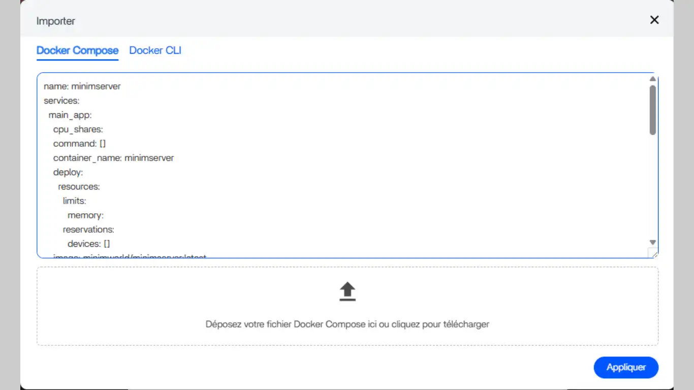 Le pop-up vous propose d’importer votre configuration avec un fichier YAML ou de copier-coller celle-ci dans la fenêtre dédiée. Vous pouvez agrandir cette fenêtre en sélectionnant les deux traits en bas à droite.