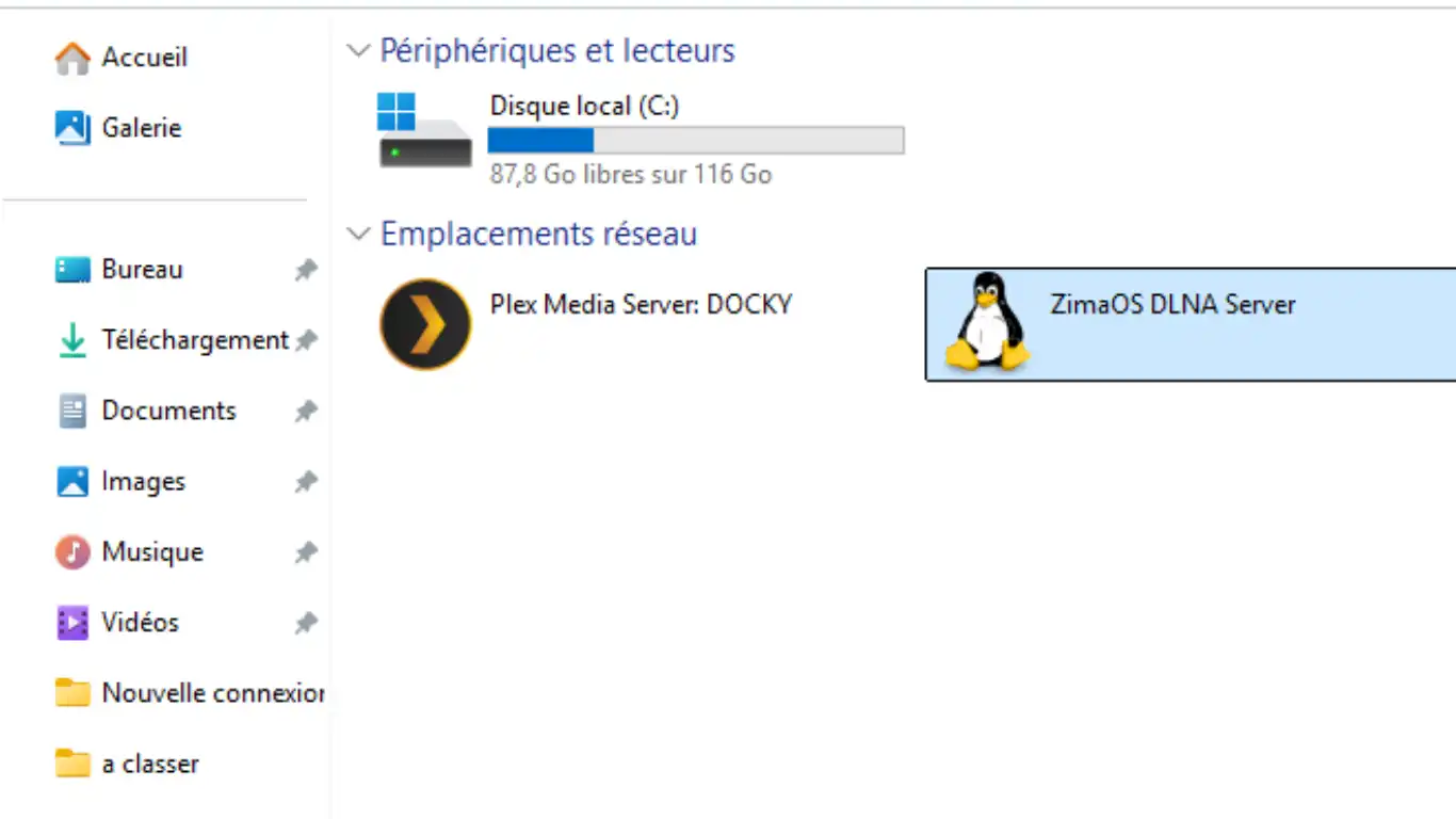 Et le serveur DLNA s'inscrit dans les emplacements réseaux (ici sous ZimaOS DLNA Server). Cliquez sur l'icône et vous accédez à votre bibliothèque.