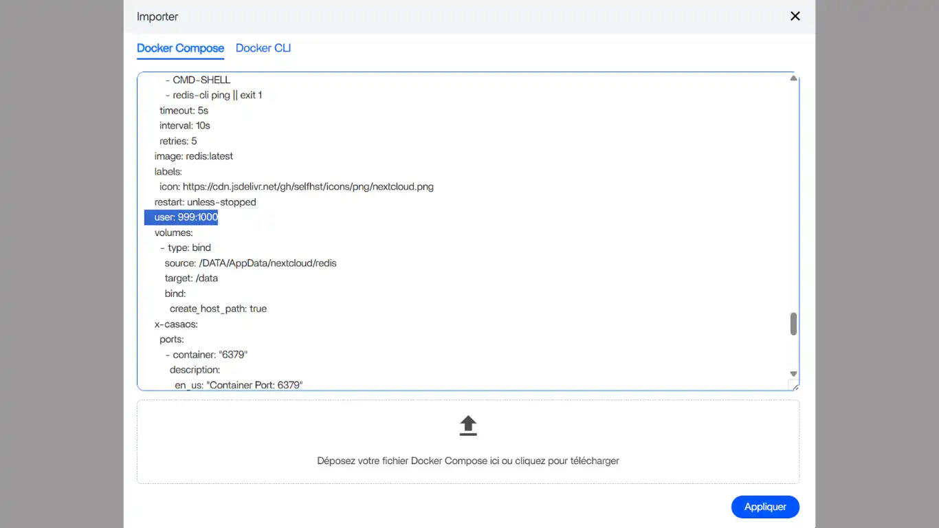 Modifiez, sur la fenêtre, l'UID et le GID au niveau du paragraphe "redis-nextcloud:" à user: 1000:1000