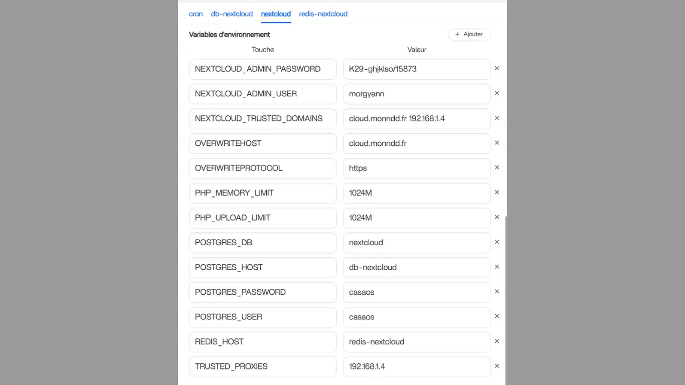 - NEXTCLOUD_TRUSTED_DOMAINS=votre ndd suivi (après espace) de votre ip locale. Par ex : cloud.monndd.fr 192.168.1.4