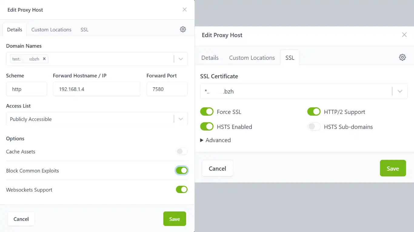 Configurer le Proxy Inversé en liant un NDD, Sous domaine ou Wildcard dédié. Le port local est déterminé pour cet article à 7580 en http avec l'IP locale de la machine hôte et, validez le Websockets Support + Block Common Exploits ainsi que Force SSL + HSTS Enabled + HTTP/2 Support.