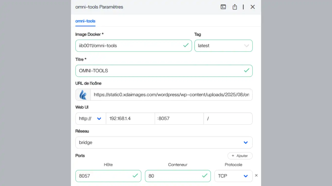 - Ports : Le Port hôte peut être changé si vous le souhaitez (à reporter sur la Web UI)