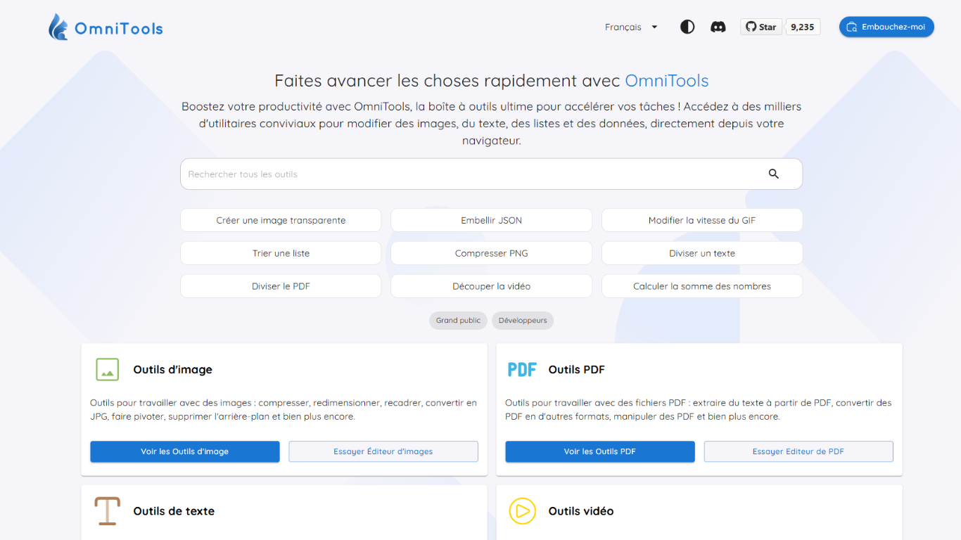 Bienvenue sur OmniTools, une application Web auto-hébergée offrant une variété d'outils en ligne pour simplifier les tâches quotidiennes. Que vous codiez, manipuliez des images/vidéos, des PDF ou traciez des chiffres, OmniTools est là pour vous.