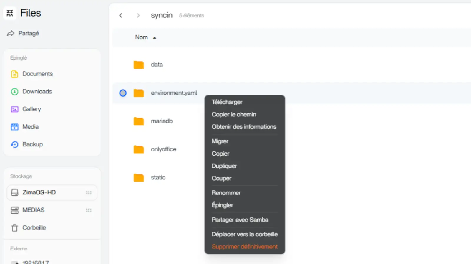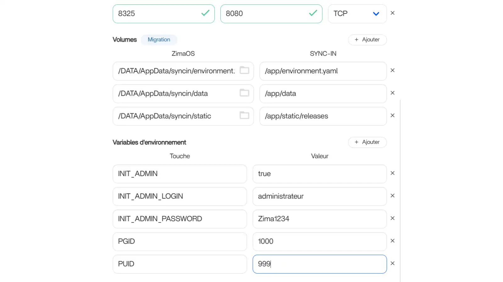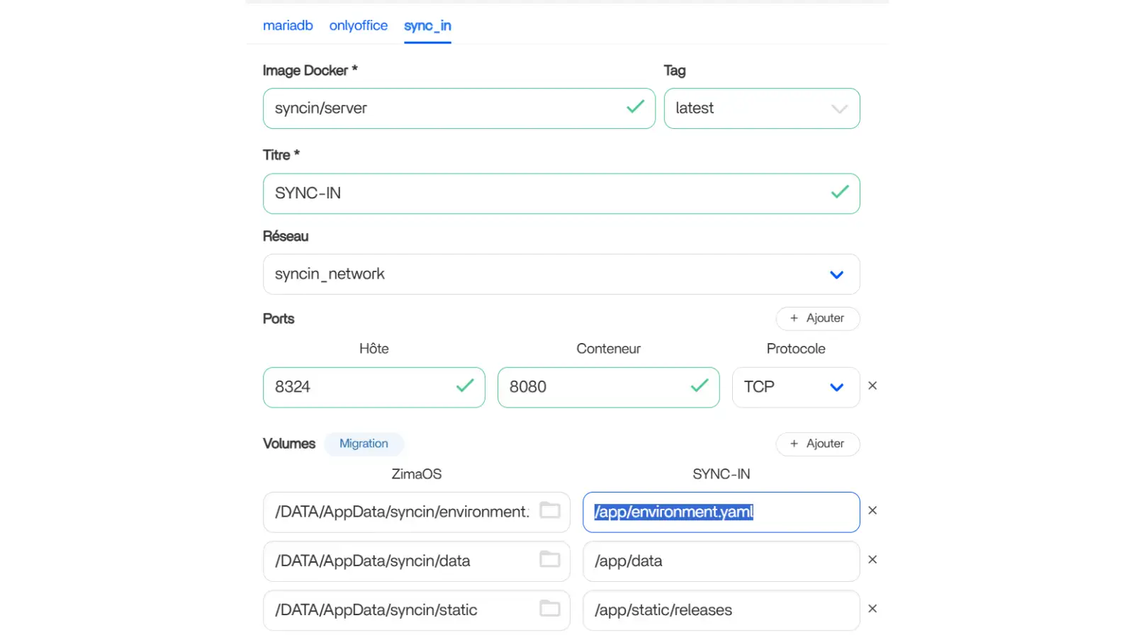 Il n’y a pas à ce jour l’application Sync-In dans l’App Store de CasaOS – ZimaOS, nous adapterons donc sa configuration.