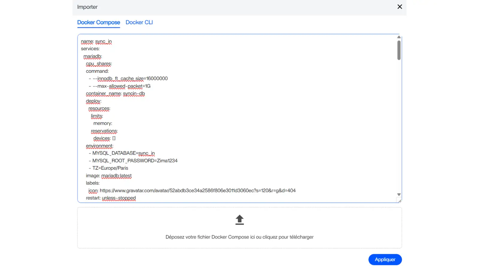 Le pop-up vous propose d’importer votre configuration avec un fichier YAML ou de copier-coller celle-ci dans la fenêtre dédiée. Vous pouvez agrandir cette fenêtre en sélectionnant les deux traits en bas à droite.
