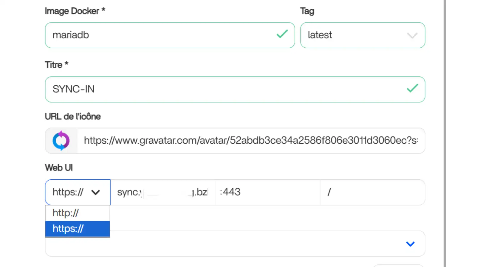 Sur l’onglet mariadb indiquez dans la fenêtre Web UI votre NDD en https avec le port 433. Optionnel, vous pouvez changer la valeur de MYSQL_ROOT_PASSWORD, dans ce cas, il vous faudra la modifier lors de la création du YAML.
