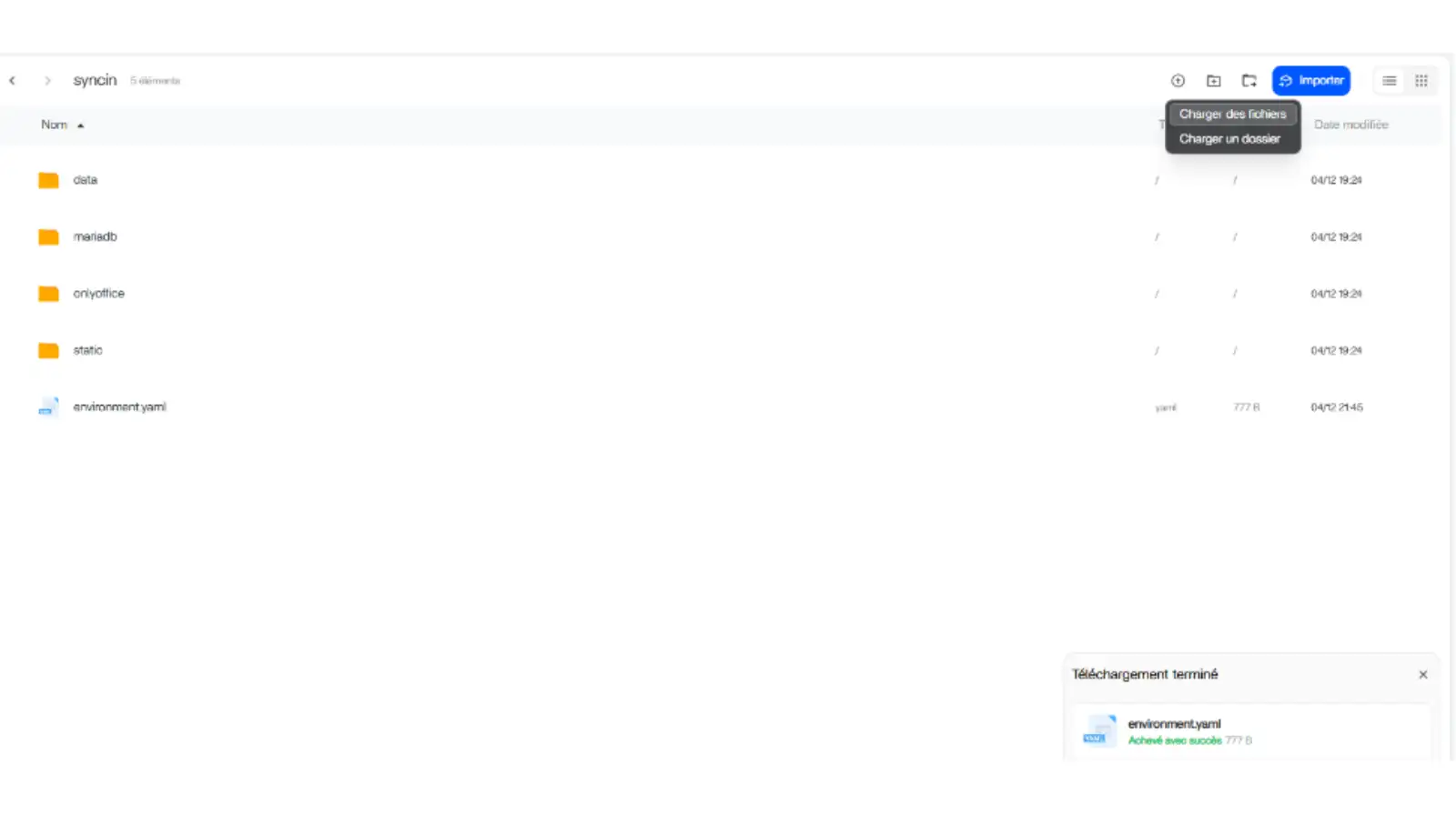 Téléverser à présent le fichier environment.yaml, créé sur le PC, via l’icône flèche en haut à droite