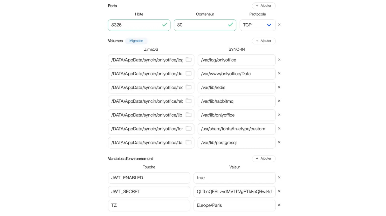 Sur l’onglet onlyoffice – modifiez le numéro de Port Hôte suivant celui choisi pour le ndd correspondant. Optionnel, vous pouvez générer votre propre clé à https://it-tools.tech/token-generator?length=64&numbers=false et l’indiquer dans la fenêtre Valeur de JWT_SECRET, dans ce cas, il vous faudra la modifier lors de la création du YAML